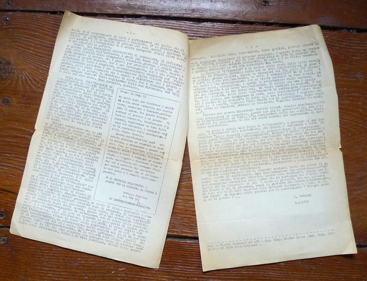 Juan Posadas,LA FESTA DE "L'HUMANITÉ", ESPRESSIONE DELLA VOLONTÀCONCENTRATA DELLA MASSA FRANCESE PER ABBATTERE IL CAPITALISMO.9.9.1974,supplemento a "LOTTA OPERAIA" n.407, Roma Ostiense,Dir.Resp. Pietro Leone,volantino, rilegatura con punto metallico,33x22 cm., pp.3,peso: g.300cod.10049CONDIZIONI DEL VOLANTINO: discrete,pagine ingiallite,piega centrale,strappetti