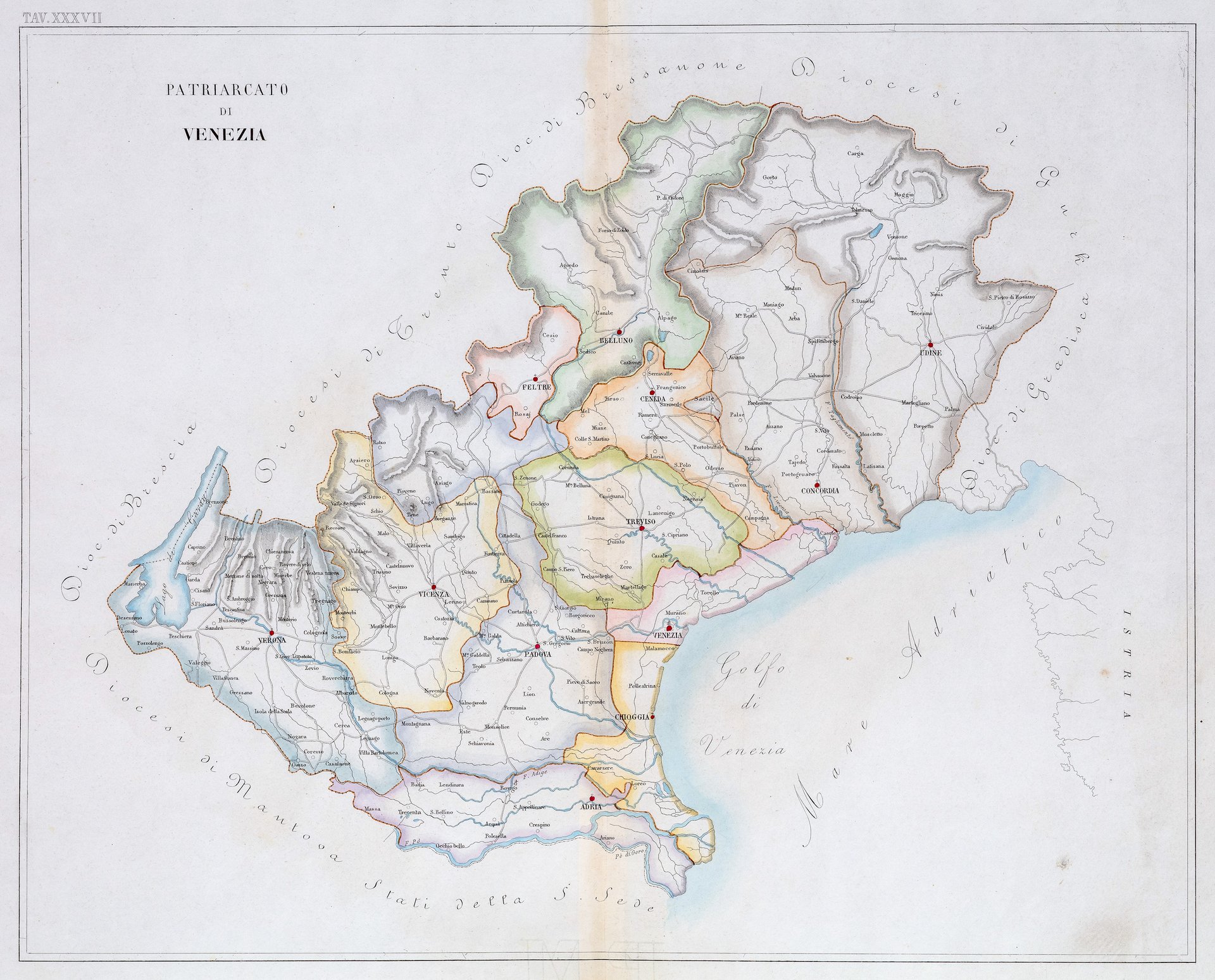 Incisione in rame al tratto, dipinta a mano d'epoca ad acquerello, mm 468x596.<BR>Rara carta geografica da "L'Orbe Cattolico ossia Atlante Geografico Storico Ecclesiastico. Opera del Commendatore Girolamo Petri Officiale minutante della segreteria di Stato". La carta mostra con colori vivaci e diversi le varie diocesi, esplicitando le divisioni ecclesiastiche. L'Atlante venne pubblicato solo per l'uso di cardinali e alti prelati in un numero limitato di copie, risultando perciò di grande rarità. In perfette condizioni, traccia di piega centrale editoriale con lievissimo, quasi impercettibile, ingiallimento della carta. <BR>Walter Goffiart, Historical Atlases, The first three Hundred Years 1570 - 1870 pag. 427 - 8, (Chicago 2003)<BR><BR>