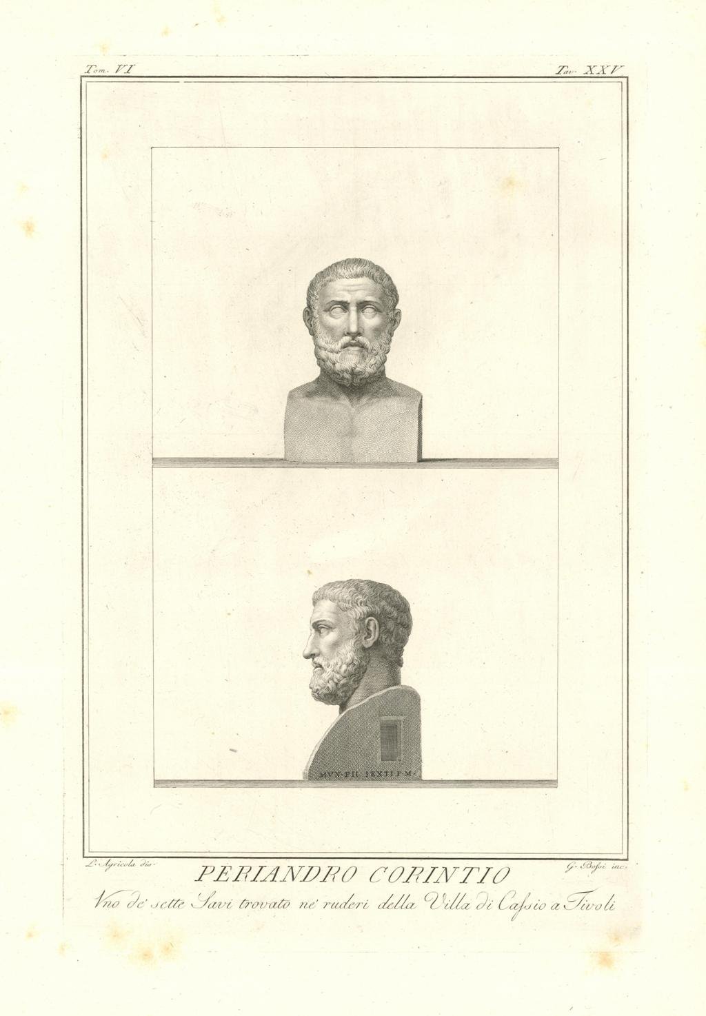 Il busto maschile e maturo raffigura uno dei Sette Sapienti, Periandro. Egli fu il secondo Tiranno di Corinto (uccise la moglie Melissa e ne abusò dopo la morte), ma conobbe un periodo di fioritura; a lui si deve l'ammodernamento del porto della città di Corinto, e con gli introiti derivati dal pedaggio abolì il pagamento delle tasse. Inserita nell'opera "Il Museo Pio-Clementino descritto da Ennio Quirino Visconti Direttore del Museo Capitolino - Tomo sesto - Dedicato alla Santita di Nostro Signore PIO SESTO Pontefice Massimo. Edito da Luigi Mirri / Mercante di quadri incontro il Palazzo Bernini. In Roma MDCCXCII con Privilegio Pontificio. Opera dedicata ai Busti del Museo Pio-Clementino
