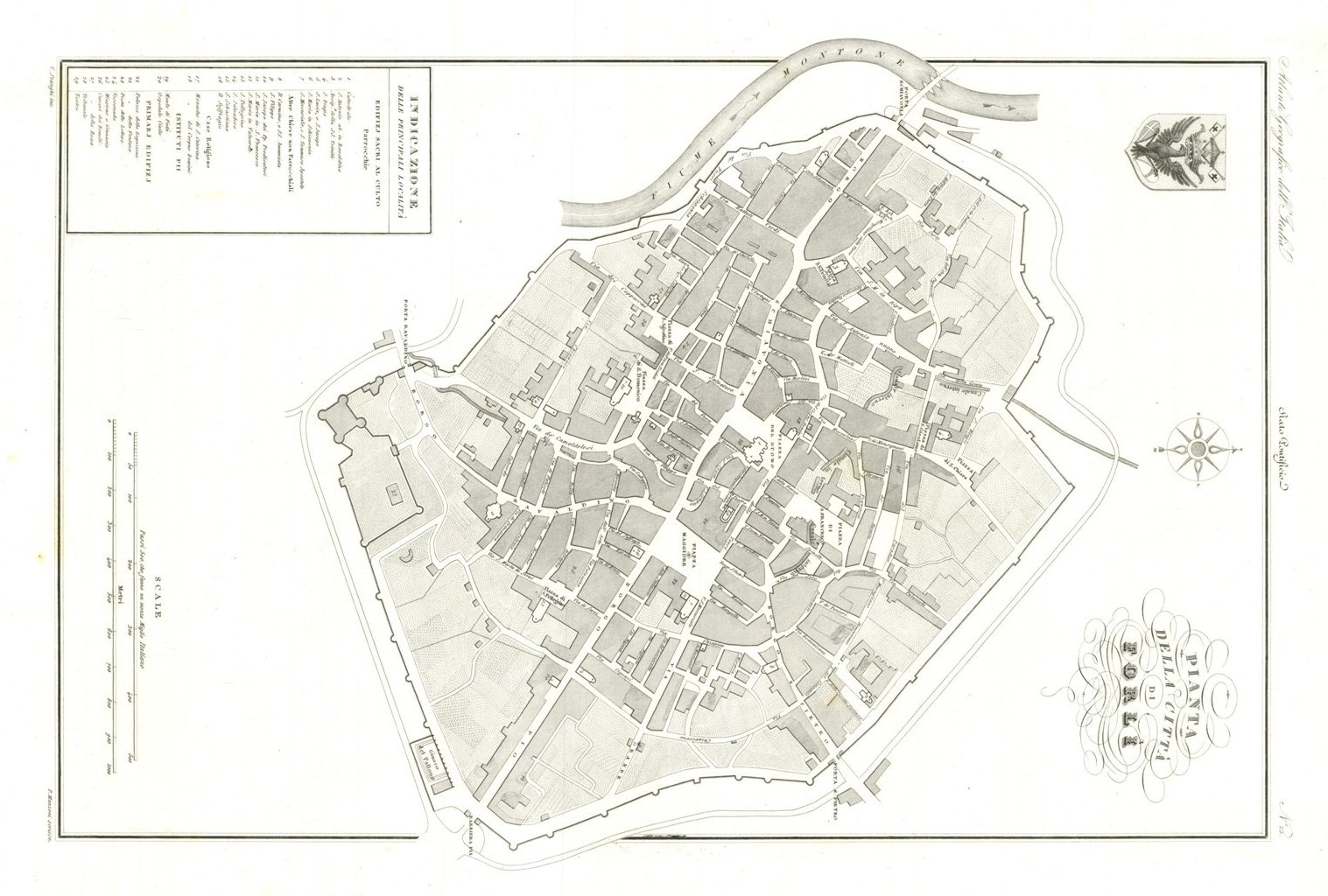 Pianta topografica della città. Riquadro in basso a sinistra le indicazioni delle principali località. Inserita nel I volume dell'opera "Atlante Geografico degli Stati Italiani delineato sopra le migliori e più moderne mappe per servire di corredo alla Corografia Fisica Storica e Statistica dell'Italia" contenente le carte dell'Italia Superiore. Descritta da Attilio Zuccagni-Orlandini, edita e stampata a Firenze nel 1844-45. Autore: Zuccagni - Orlandini edit. & V.Stanghi inc. Luogo: Forlì. Anno: 1844. Tecnica: incisione in rame. Dimensioni: 509x340 mm