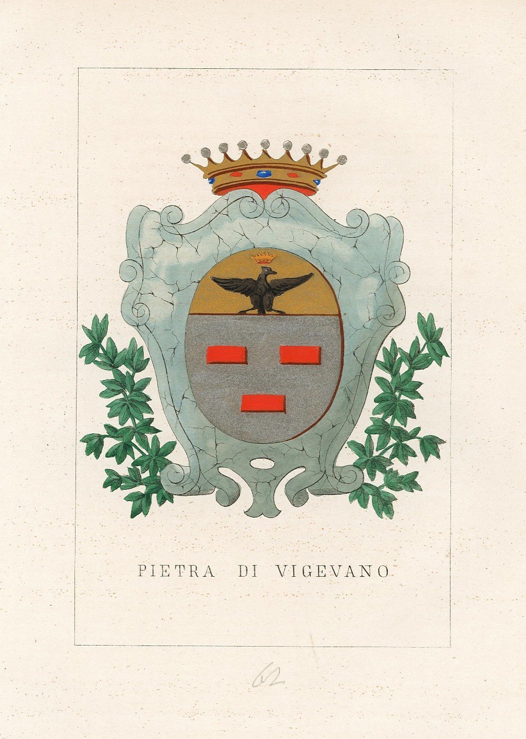 Stampa, antica ed originale, con raffigurato lo stemma araldico della famiglia finemente colorato a mano all'epoca con vivace acquerellatura a tempera. Inserita nell'opera "Storia delle Famiglie Illustri Italiane" pubblicata a Firenze dall'editore Ulisse Diligenti. La stampa è accompagnata da pagine con testo storico descrittivo.