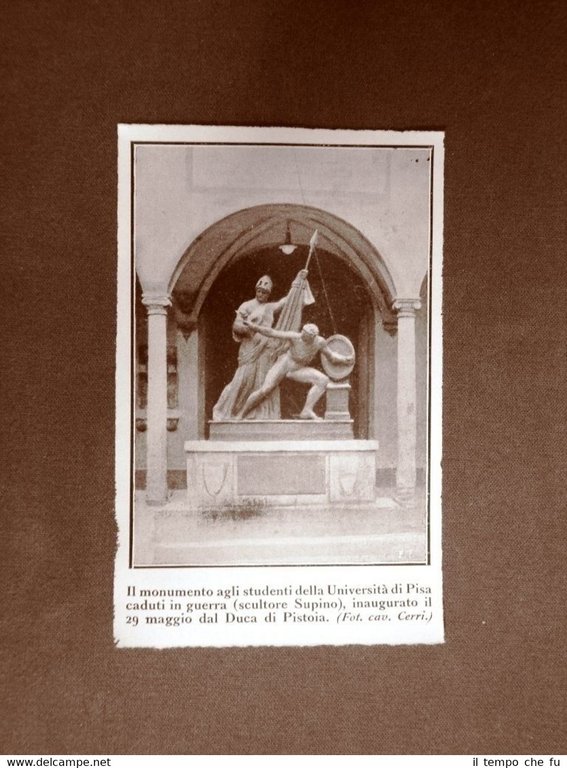 Rara stampa Estratta da Rivista d'epoca del 1924 . .stampa che ha quindi oltre 92 anni! Pisa 29 maggio 1924 Monumento agli Studenti dell'Università di Pisa caduti in guerra Scultore Supino Inaugurato dal Duca di Pistoia II1924-031 Dimensioni Cm 8,00 x 12,00 Qualora vogliate delle scansioni migliori contattateci, soddisferemo ogni vostra richiesta. PaypalCarta di creditoBonifico bancario Accuratamente adagiate su un cartoncino e protette da pellicola trasparente rigida,il tutto viene inserito dentro plico di adeguate dimensioni per proteggerne l'integrità.
