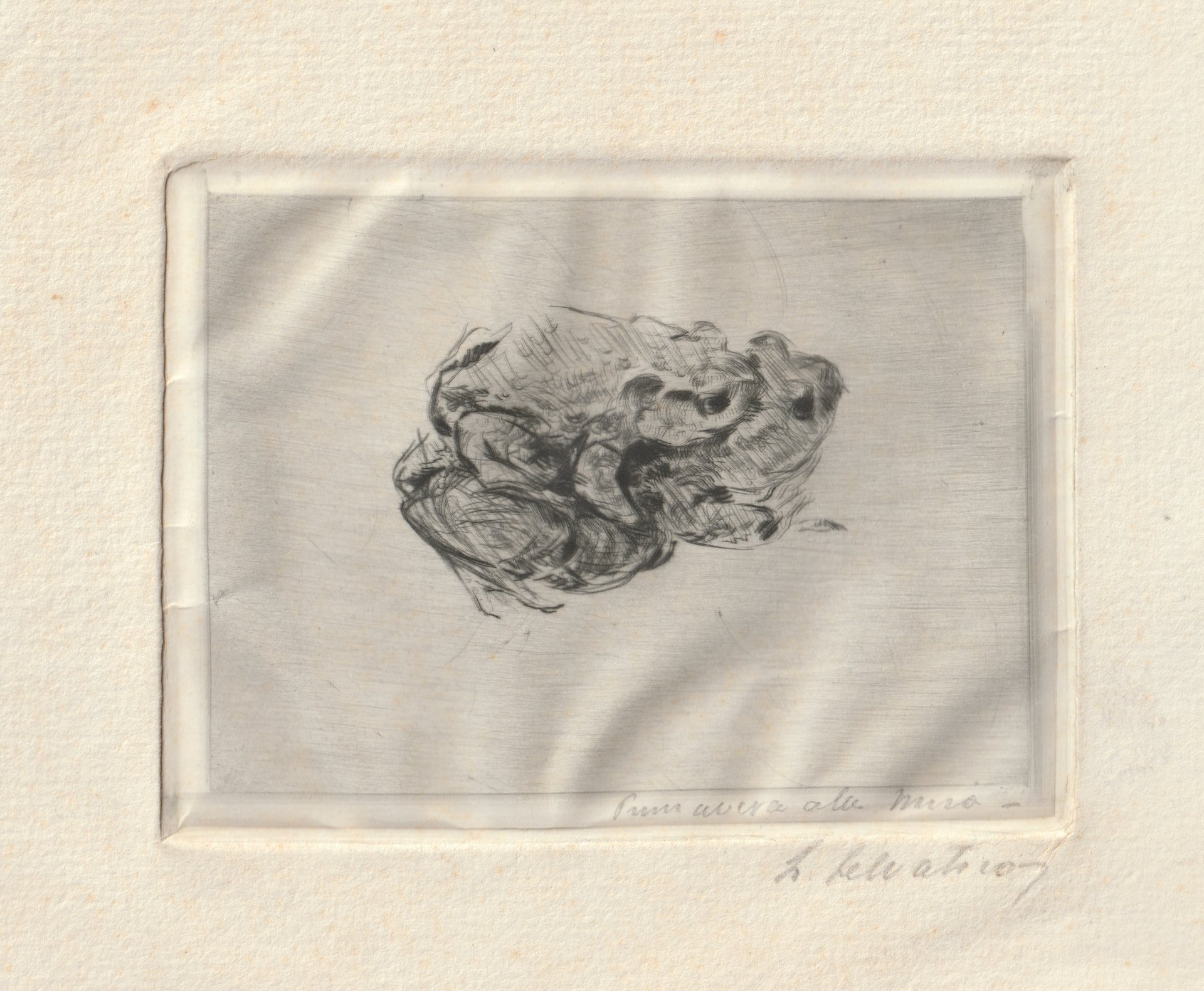 Piccola lastra che coglie dal vero una rana e un rospo. Lino Selvatico abitava l'omonima antica villa, oggi villa Selvatico-Granata, nella Città di Mira. Firma e titolo a matita nel margine inferiore a matita: Primavera alla Mira/L Selvatico. Impressione eccellente in inchiostro verde scuro con velatura di fondo, impressa su carta spessa color avorio, ampi margini. Perfetto stato di conservazione.