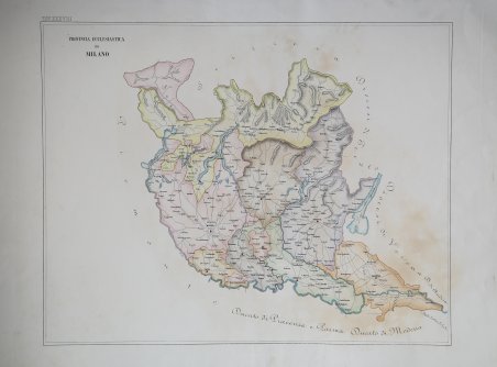 Carta geografica raffigurante le legazioni ecclesiastiche della regione, tratta dall’Orbe Cattolico ' di Girolamo Petri. L'Orbe Cattolico ossia Atlante Geografico Storico Ecclesiastico ' fu pubblicato a Roma in 3 volumi nel 1858-1859. Le mappe di grande formato sono finemente incise e ben colorate. È senza dubbio una delle opere più finemente incise ed eleganti della metà del XIX secolo. Ogni mappa mostra le varie diocesi, ognuna delle quali è contraddistinta da colori vivaci che ne segnano la sede, e altre città importanti. Sebbene le caratteristiche geografiche siano chiaramente espresse, le mappe sono volutamente piuttosto scarne di dettagli, in modo da non sminuire visivamente il loro scopo, che è quello di mostrare le divisioni ecclesiastiche. Nel creare l'atlante, Petri ha sottolineato di aver attinto solo alle "fonti più attendibili", comprese le mappe degli archivi vaticani e delle diocesi d'oltremare L'atlante fu pubblicato in un numero molto limitato di esemplari ad uso esclusivo dei cardinali e degli amministratori di alto rango, il che ne spiega la grande rarità odierna. Girolamo Petri (1806 - 1871) fu una figura importante nell'amministrazione della Chiesa cattolica romana durante il regno di Pio IX. Nacque a Onano (Viterbo, Lazio), figlio di un funzionario vaticano che in seguito divenne governatore di Frascati. Il lavoro di Petri fu svolto in un periodo in cui la Chiesa era sotto assedio in Europa, ma, al contrario, aveva grandi ambizioni di espansione all'estero, in particolare in Asia e in Africa. La metà del XIX secolo fu un periodo di grandi cambiamenti a Roma. L'atlante faceva senza dubbio parte degli ultimi sforzi del Vaticano per comprendere e controllare la sua vasta influenza in tutto il mondo, resuscitando il concetto popolare di province ecclesiastiche diffuso nelle opere di Nicolas Sanson e altri cartografi del XVII secolo. La Calcografia Nazionale (Istituto per la Grafica) conserva ancora 135 rami di questo rarissimo atlante. Incisione in rame, coloritura coeva, leggera brunitura, per il resto in ottimo stato di conservazione. Bibliografia Walter Goffart, ' Historical Atlases: The First Three Hundred Years, 1570-1870 ' (Chicago, 2003), p. 427-8; J.A.B. Jongeneel, ' Philosophy, Science, and Theology of Mission in the 19th and 20th Centuries: A Missiological Encyclopedia ' (1995), p. 264. A very rare map showing the dioceses of Catholic organization, taken from ' L'Orbe Cattolico ' by Girolamo Petri. L’Orbe Cattolico ossia Atlante Geografico Storico Ecclesiastico’ ' was published in Rome in 3 volumes in 1858-1859. ' The large-format maps are finely engraved and beautifully colored. The atlas is a testament to the artistry of the engravers and the relative indifference of the publisher to the commercial success of the work. It is without question one of the most finely engraved and elegant works of the mid-19th Century. Each map shows the various dioceses, which are each distinguished by their own bright colors, marking their seats, as well as other major towns. While key geographical features are expressed throughout, the maps are otherwise intentionally rather sparing of detail, so as not to visually detract from their purpose, which is the show the ecclesiastical divisions. In creating the atlas, Petri noted that he drew only upon the “most trusted sources”, including maps from the Vatican archives and overseas dioceses. The atlas was by far and away the finest ecclesiastical atlas created during the 19th Century, featuring exceptionally beautiful examples of thematic cartography. The uncommonly beautiful atlas was published in only a very small number of examples for the exclusive use of Cardinals and high-ranking administrators, accounting for the great rarity today. Petri who was commissioned by Pope Pius XI thus created during a time when the Church was under siege within Europe, but, conversely, while it had major ambitions for expansion overseas, particularly in Asia and Africa. The mid-19th Century was a period of dramatic change in Rome. The atlas was no doubt part of the Vatican's last-ditch efforts to understand and control its vast influence around the world, resurrecting the popular concept of ecclesiastical provinces popularized in works by Nicholas Sanson and others during the 17th Century. The Calcografia Nazionale still preserves 135 copperplates of this extremely rare atlas. Bibliografia Walter Goffart, ' Historical Atlases: The First Three Hundred Years, 1570-1870 ' (Chicago, 2003), p. 427-8; J.A.B. Jongeneel, ' Philosophy, Science, and Theology of Mission in the 19th and 20th Centuries: A Missiological Encyclopedia ' (1995), p. 264. Cfr.