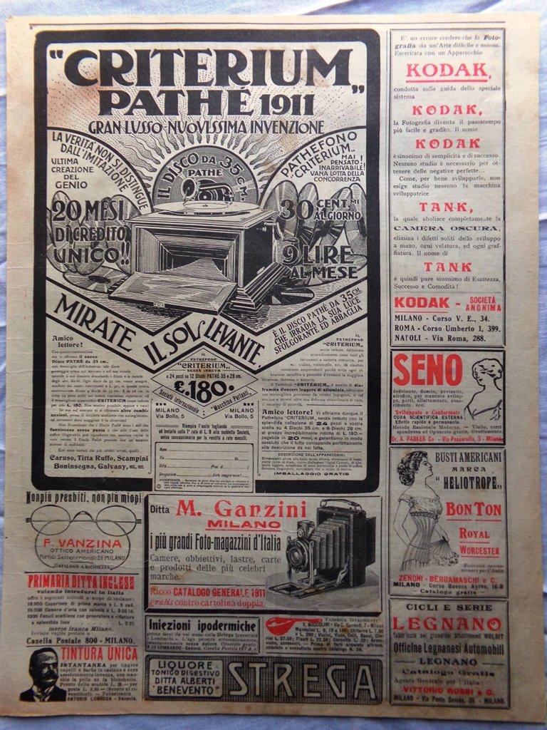 Pubblicità del 1911 Criterium Disco Pathé Liquore Strega Ganzini Kodak Scambio