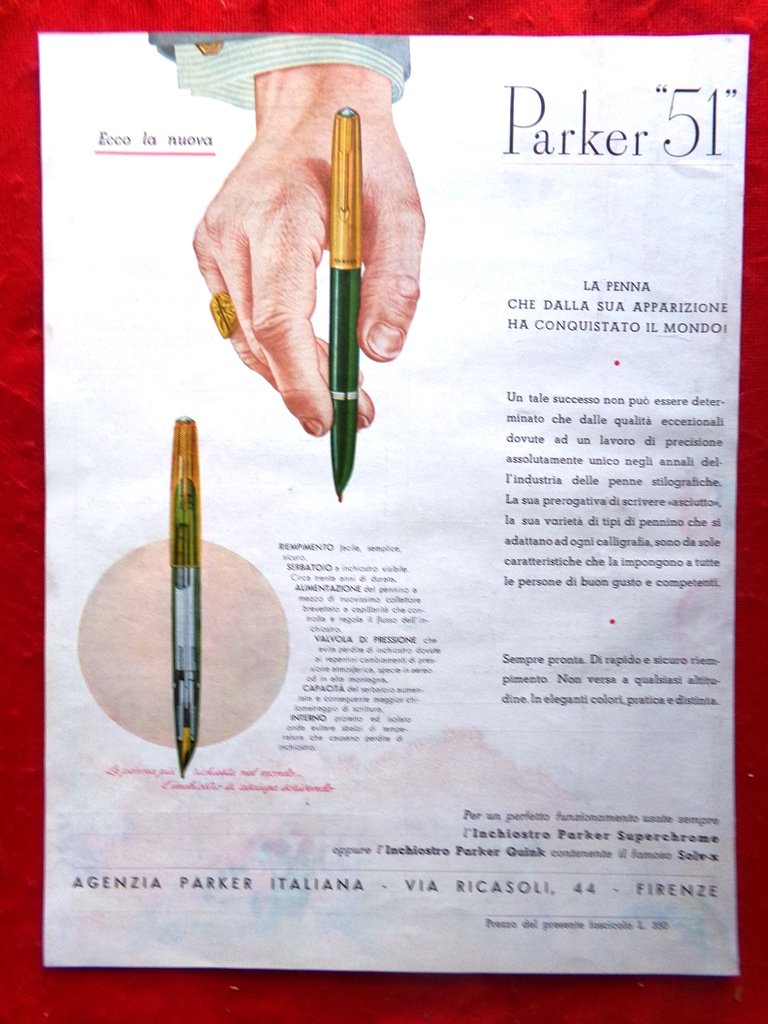 Pubblicità del 1950 Penna Parker 51 Agenzia di Firenze