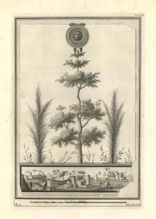 Incisione raffigurante dipinti con quercia e piccola agreste ritrovate negli scavi. Tratta dal tomo primo della monumentale opera "Le Pitture antiche d'Ercolano e contorni incise con qualche spiegazione", sontuosamente illustrata da diversi artisti tra i quali: Giuseppe Aloja, Nicola Billi, Pietro Campana, Nicola Cesarano, P. Gaultier, Francesco Martano, Filippo Morghen, Camillo Paderni, Rocco Pozzi, N. Ricci, Nicola Vanni, Francisco de Vega. Edita a Napoli dalla Regia Stamperia nel 1757