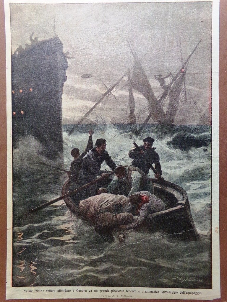 Natale triste: veliero affondato a Genova da un grande piroscafo tedesco e drammatico salvataggio dell'equipaggio (disegno di Achille Beltrame)