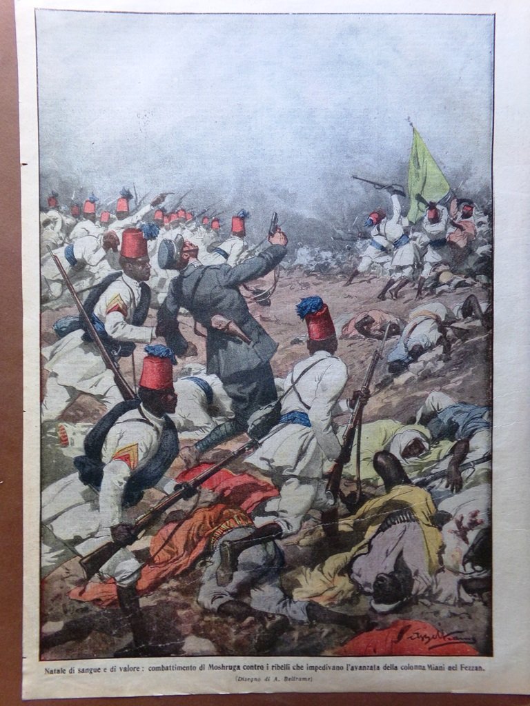 Natale di sangue e di valore: combattimento di Moshruga contro i ribelli che impedivano l'avanata della colonna Miani nel Fezzan (disegno di Achille Beltrame)
