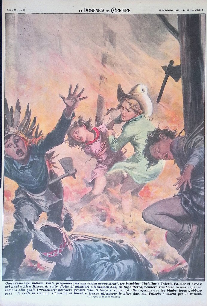 Giocavano agli indiani. Fatte prigioniere da una "tribù avversaria" tre bambine, Christine e Valeria Palmer di nove e sei anni e Alva Hiscox di sette, figlie di minatori a Mountain Ash, in Inghilterra, vennero rinchiuse in una capanna intorno alla quale i "vincitori" accesero grandi falò. Il fuoco si comunicò alla capanna e le tre bimbe, legate, ebbero presto le vesti in fiamme. Valeria è morta per le ustioni (Walter Molino)