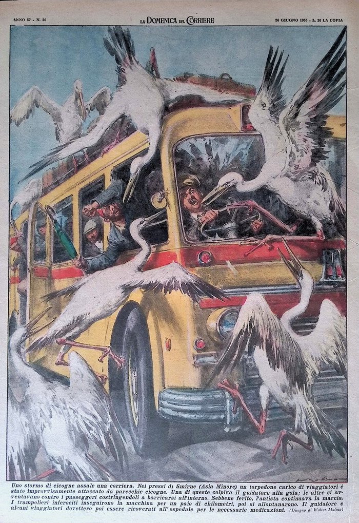Nei pressi di Smirne (Asia Minore) un torpedone carico di viaggiatori è stato improvvisamente attaccato da parecchie cicogne. Una di queste colpiva il guidatore alla gola; le altre si avventavano contro i passeggeri costringendoli a barricarsi all'interno. Sebbene ferito, l'autista continuava la marcia. I trampolieri inferociti inseguirono la macchina per un paio di chilometri, poi si allontanarono. Il guidatore e alcuni viaggiatori dovettero poi essere ricoverati all'ospedale per le necessarie medicazioni (Walter Molino)
