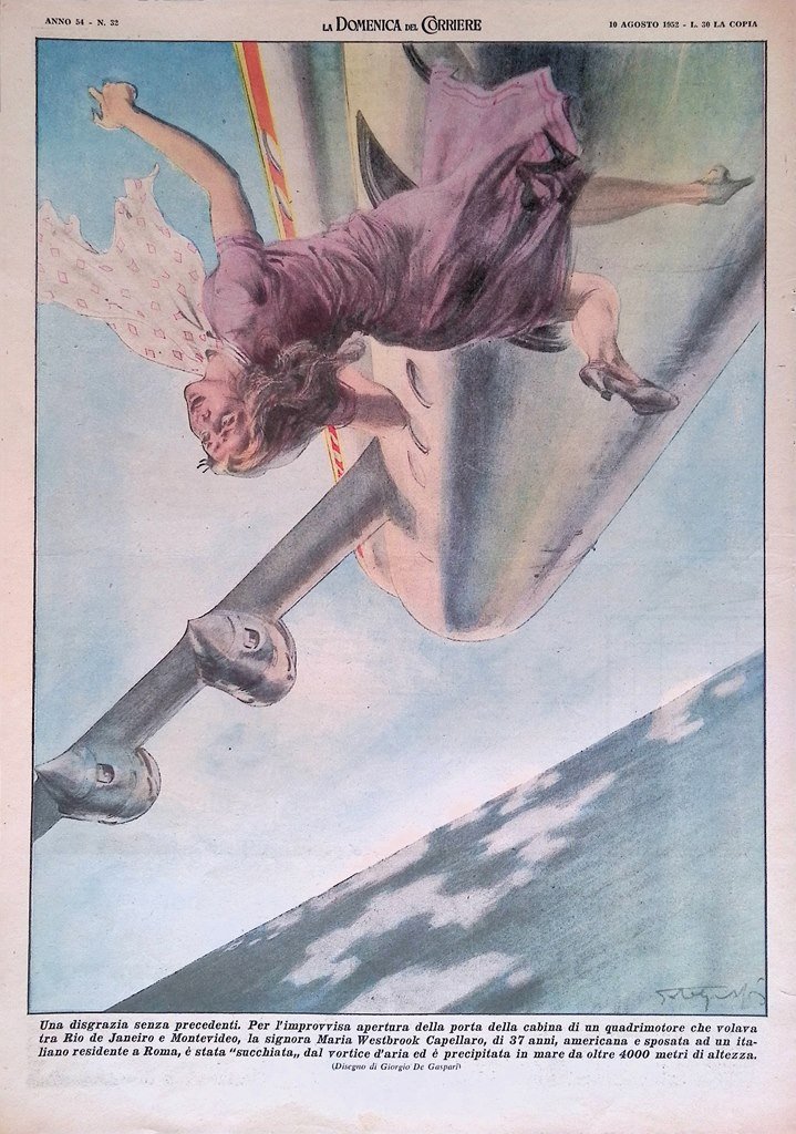 Per l'improvvisa apertura della porta della cabina di un quadrimotore che volava tra Rio de Janeiro e montevideo, la signora Maria Westbrook Capellaro stata "succhiata" dal vortice d'aria ed è precipitata in mare da oltre 4000 metri d'altezza (Giorgio De Gaspari)