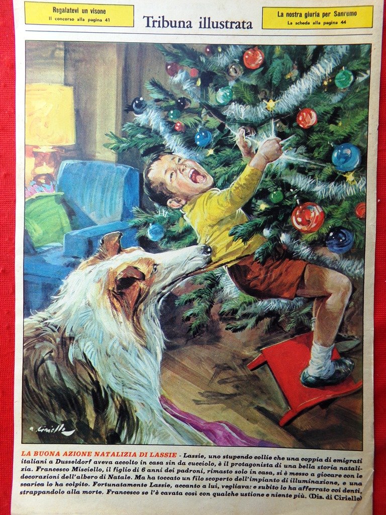Lassie, uno stupendo collie che una coppia di emigrati italiani a Dusseldorf aveva accolto in casa sin da cucciolo, è il protagonista di una bella storia natalizia. Francesco Misciello, il figlio di 6 anni dei padroni, rimasto solo in casa, si è messo a giocare con le decorazioni dell'albero di Natale. Ma ha toccato un filo scoperto dell'impianto di illuminazione, e una scarica lo ha colpito. Fortunatamente Lassie, accanto a lui, vegliava; e subito lo ha afferrato coi denti strappandolo alla morte. Francesco se l'è cavata così con qualche ustione e niente più. (disegno di Ciriello)