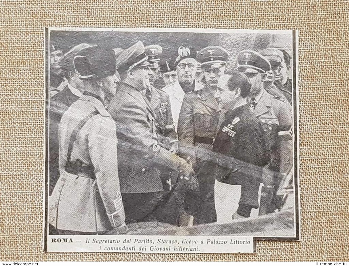 Rara stampa estratta da pubblicazione del 1936 Roma nel 1936 Palazzo Littorio Il Segretario del Partito Starace riceve i comandanti dei Giovani hitleriani Dimensioni: Cm 12,00 x 10,00 Codice prodotto: 1909-066 Qualora vogliate delle scansioni migliori contattateci, soddisferemo ogni vostra richiesta. Paypal Carta di credito Bonifico bancario Accuratamente adagiate su un cartoncino e protette da pellicola trasparente rigida, il tutto viene inserito dentro plico di adeguate dimensioni per proteggerne l'integrità.