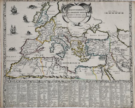 Rara carta geografica dell'Impero Romano incisa da Henry le Roy per Michael van Lochom. Si basa, come enunciato nel titolo sulla carta che Abraham Ortelius realizza per il sul atlante storico, il ' Parergon. Michel van Lochom (Anversa, 1601 - Parigi, 1647) è un incisore ed editore fiammingo. Michel van Lochom nacque il 28 aprile 1601 ad Anversa, dove fu battezzato il 5 maggio. È il figlio di Hans van Lochom, anche lui incisore, e di Clara Janssens. Divenne membro della Gilda di San Luca di Anversa nel 1613, dove fu allievo di Abraham van Merlen. Divenne libero maestro della corporazione nel 1621. Si trasferì a Parigi nel 1625, dove fu attivo come incisore ed editore di stampe fino al 1647. Sposò Marguerite Lenoir, figlia di un libraio, il 12 novembre 1625, dopo aver rinunciato alla sua fede protestante. Ha inciso principalmente scene religiose e ritratti. Lochom divenne anche l'incisore del re per la calcografia. Morì a Parigi il 23 gennaio 1647. Sebbene priva di data la carta può essere ricondotta al periodi 1640-47. Acquaforte, stampata su carta vergata coeva, irregolarmente rifilata al rame con parziale o totale perdita della cornice ornamentale, in ottimo stato di conservazione. Molto rara. ' Rare map of the Roman Empire engraved by Henry le Roy for Michael van Lochom. It is based, as stated in the title on the map that Abraham Ortelius made for his historical atlas, the Parergon. Michel van Lochom (Antwerp, 1601 - Paris, 1647) is a Flemish engraver and publisher. Michel van Lochom was born on April 28, 1601 in Antwerp, where he was baptized on May 5. He is the son of Hans van Lochom, also an engraver, and Clara Janssens. He became a member of the guild of Saint Luke of Antwerp in 1613, where he was a pupil of Abraham van Merlen. He became freemaster of the guild in 1621. He moved to Paris in 1625, where he was active as an engraver and print editor until 1647. He married Marguerite Lenoir, daughter of a bookseller, on November 12, 1625, after renouncing his Protestant faith. He mainly engraved religious scenes1 and portraits4. Lochom became the king's engraver for the engravings. Michel van Lochom died in Paris on January 23, 1647. Although undated the map can be traced to the 1640-47 period. Etching, printed on coeval laid paper, irregularly trimmed to copper with partial or total loss of the ornamental frame, in excellent condition. Very rare. Cfr.