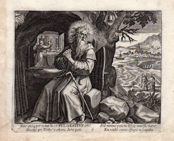SAN FULGENZIO - THOMAS de LEU [Leeuw or Le Leup or Deleu] (1560-1612) "Nunc quoq totum lucet FULGENTIUS orbe" Viaggiò molto e si segnala un soggiorno in Sardegna, dove in un monastero di Cagliari divenne maestro di vescovi, preti e monaci. | Stampe | THOMAS de LEU [Leeuw or Le Leup or Deleu]