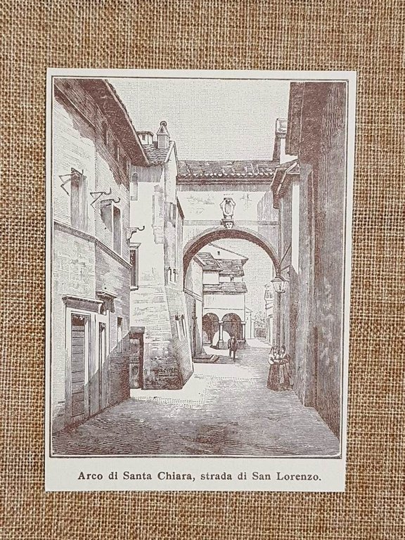 Rara stampa estratta da pubblicazione di fine '900 Sansepolcro nell'800 Arco di Santa Chiara e strada di San Lorenzo Arezzo Toscana Dimensioni Cm 9,00 x 12,00 Codice prodotto: LCCI - 031 PayPal Carta di credito Bonifico bancario Inserita dentro plico di adeguate dimensioni per proteggerne l'integrità Spedizione con posta ordinaria o raccomandata scelta dall’Acquirente nel momento del pagamento Clicca qui per accedere al nostro Store ed al suo sterminato archivio