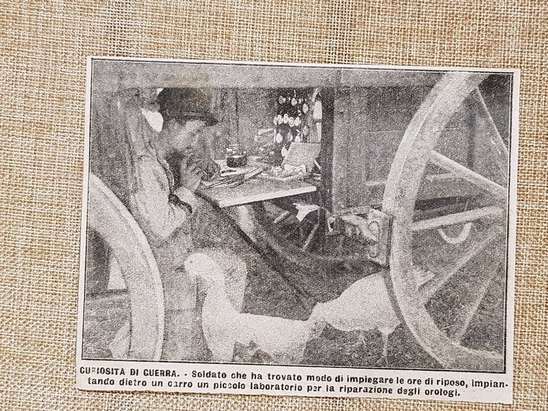 Soldato allestisce laboratorio dietro carro per riparare orologi fronte 1915 WW1