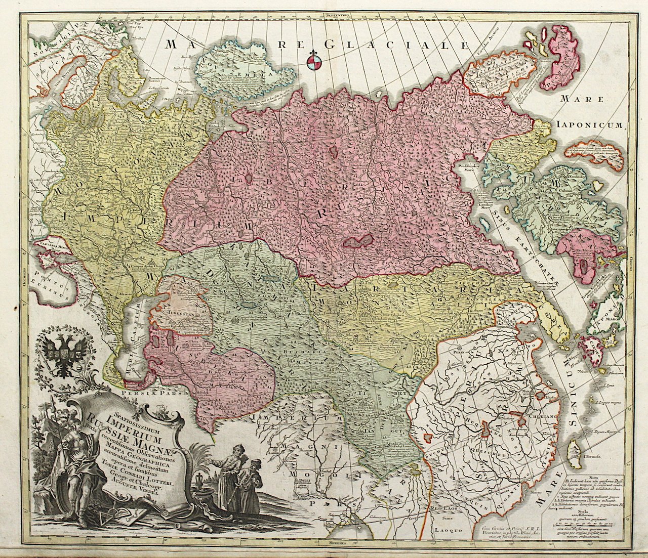 Incisione in rame, mm 500x575, coloritura originale d'epoca, grande cartiglio decorativo con aquila imperiale a sinistra. Da "Atlas novus" o "Grosser Atlas". Bell'esemplare in splendida coloritura. Ottimo stato di conservazione.<BR>Lotter proseguì nell'attività di Seutter utilizzando spesso le medesime lastre con minime variazioni, ma pubblicando anche materiale inedito spesso assai decorativo e a volte raro. Le sue carte hanno sempre colori brillanti e cartigli elaborati come quelle di Seutter, che dopo un apprendistato presso Homann a Norimberga, trasferitosi ad Augsburg verso il 1720, aprì la propria attività superando il maestro sotto il profilo della bellezza. <BR>Copperplate, original colour, mm 500x575. Beautiful historical map of the russian empire. Decorated with a magnificent cartouche. From "Atlas novus" and "Grosser Atlas". Very good condition. Lotter run then the business using mostly Seutter's plates but adding some new ones also. Seutter, after having worked with Homann in Nuremberg, opened his own activity in Augsburg around 1720. His maps always have elaborate cartouches and are very decorative and printed on good paper. Lotter married Seutter's daughter in 1740 and succeeded him in 1756 <BR><BR>