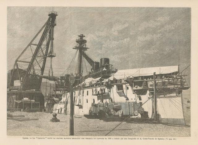 Spezia. - La "Lepanto" sotto la grande macina idraulica che imbarca un cannone da 100 a bordo | Stampe | Anonimo