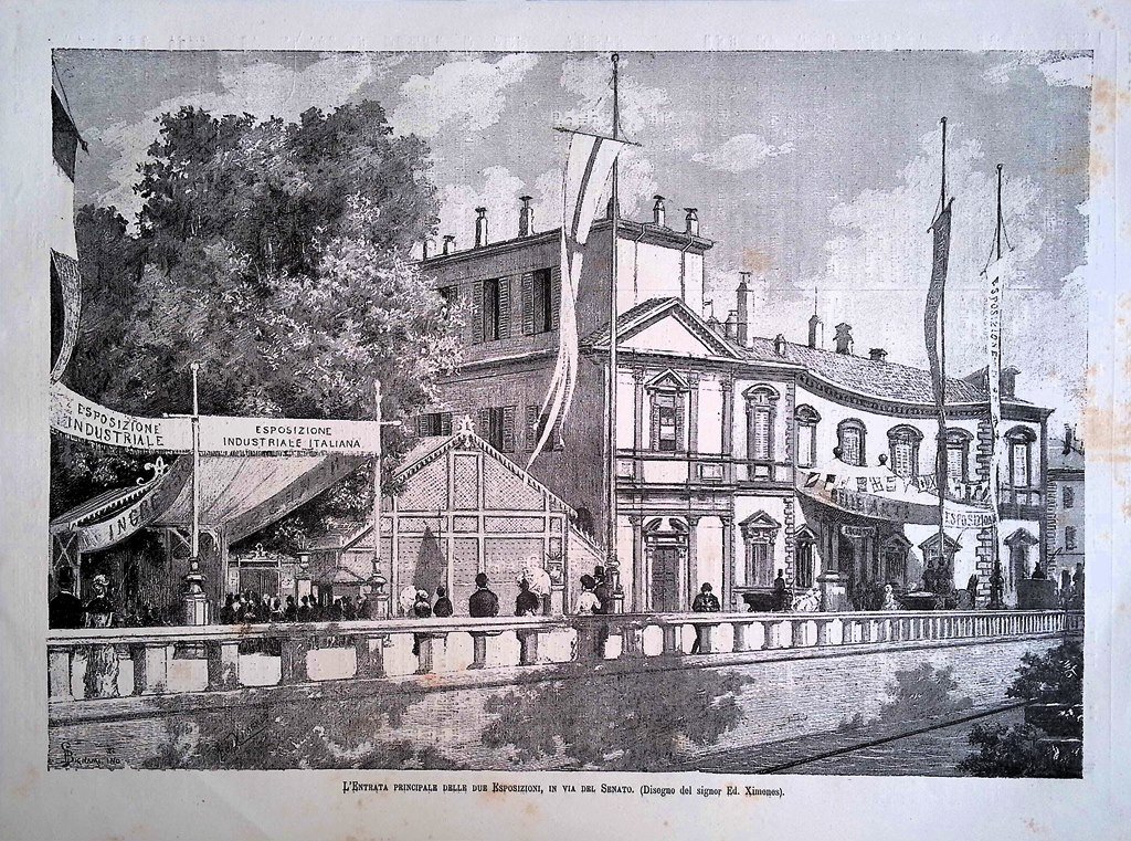 Stampa del 1881 Entrata Due Esposizione Milano Via del Senato Ximenes