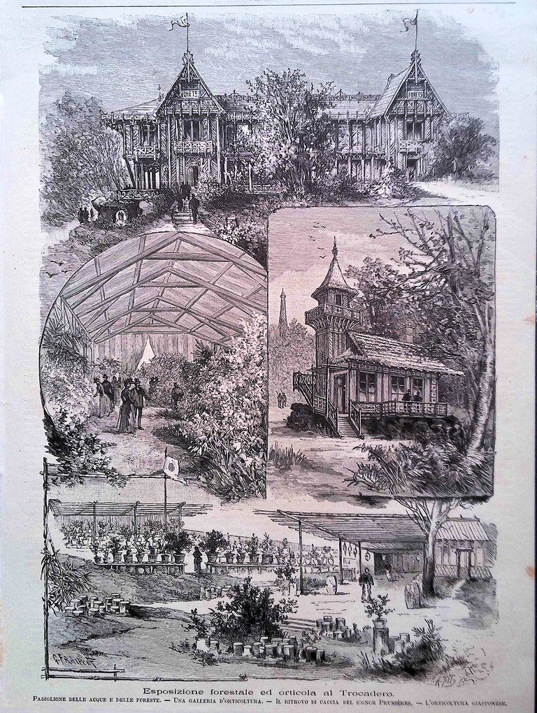 Stampa del 1889 Esposizione Forestale ed Orticola al Trocadero Padiglione Acque