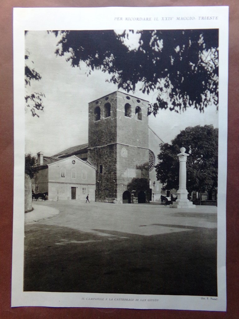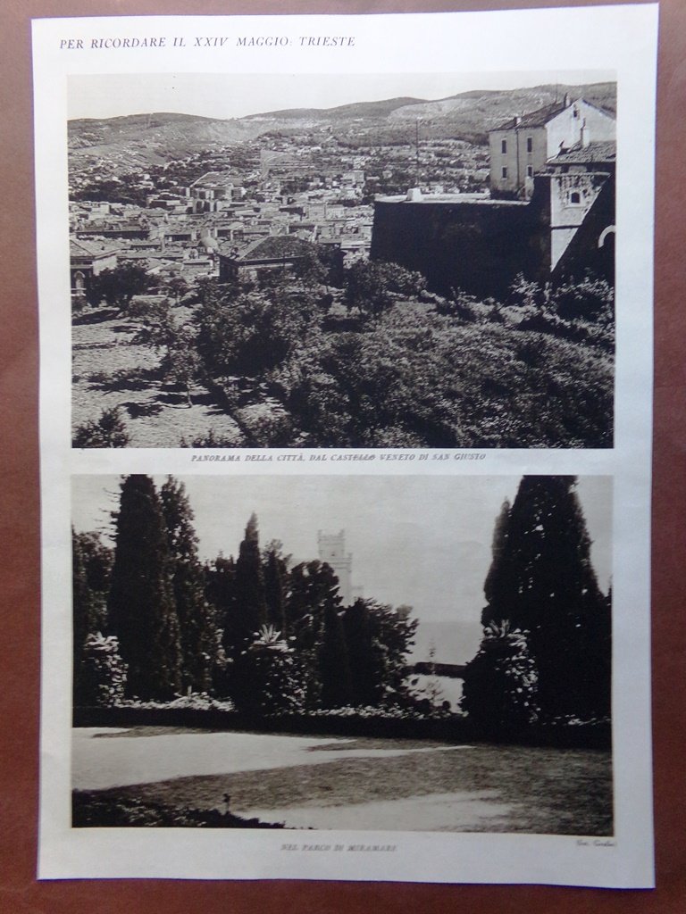 Stampa del 1927 Trieste Cattedrale San Giusto Castello Parco Miramare Panorama