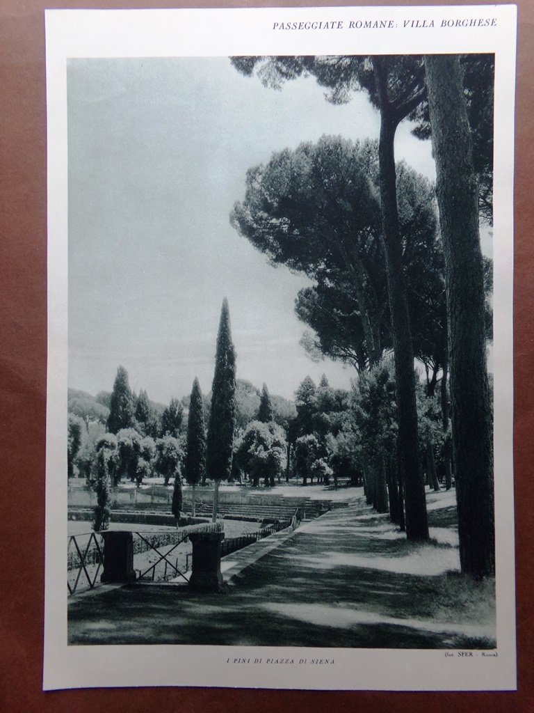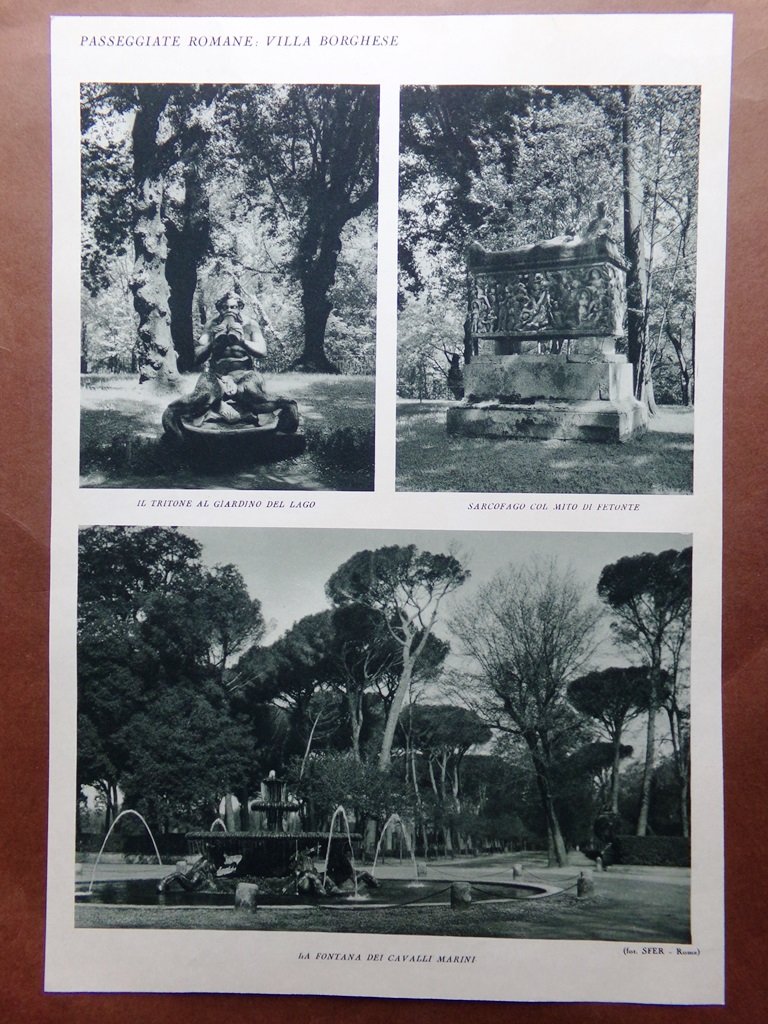 Stampa del 1927 Villa Borghese Fontana Cavalli Marini Fetonte Tritone Lago Pini
