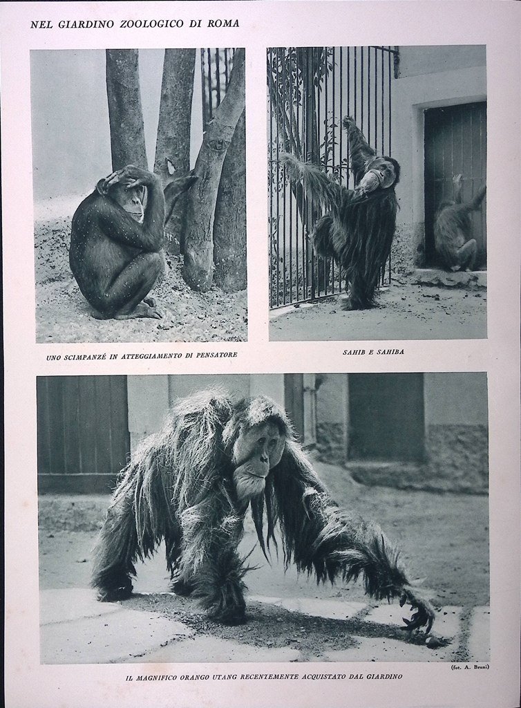 Stampa del 1928 Giardino Zoologico di Roma Leoni Orango Scimmie