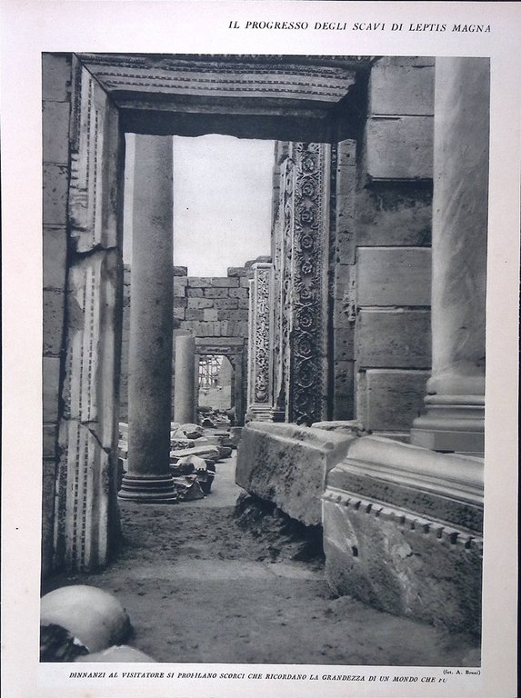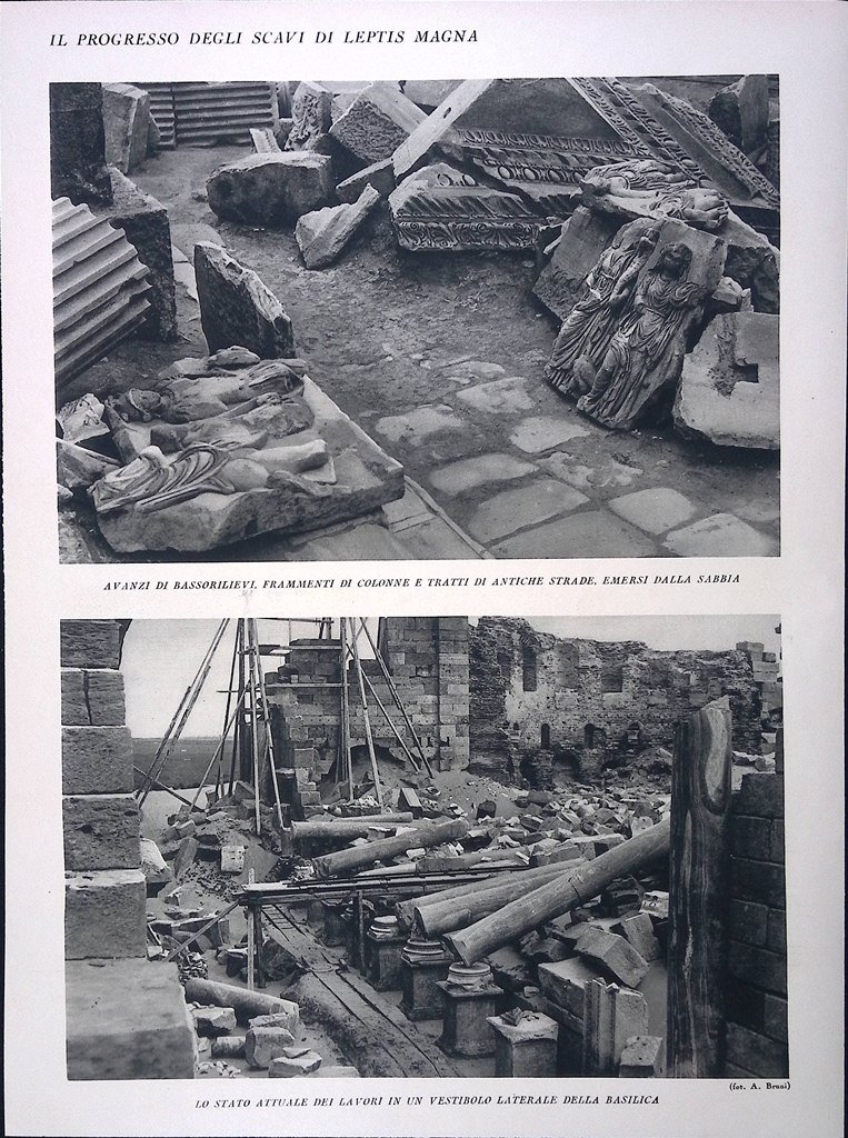 Stampa del 1928 Scavi Leptis Magna Scorci Grandezza Frammenti Strade Basilica