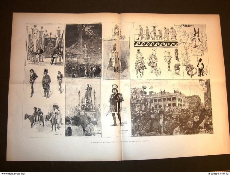 Stampa enorme del 1891 Carnevale di Roma Carro Giullari Prefetto Bandiere rioni