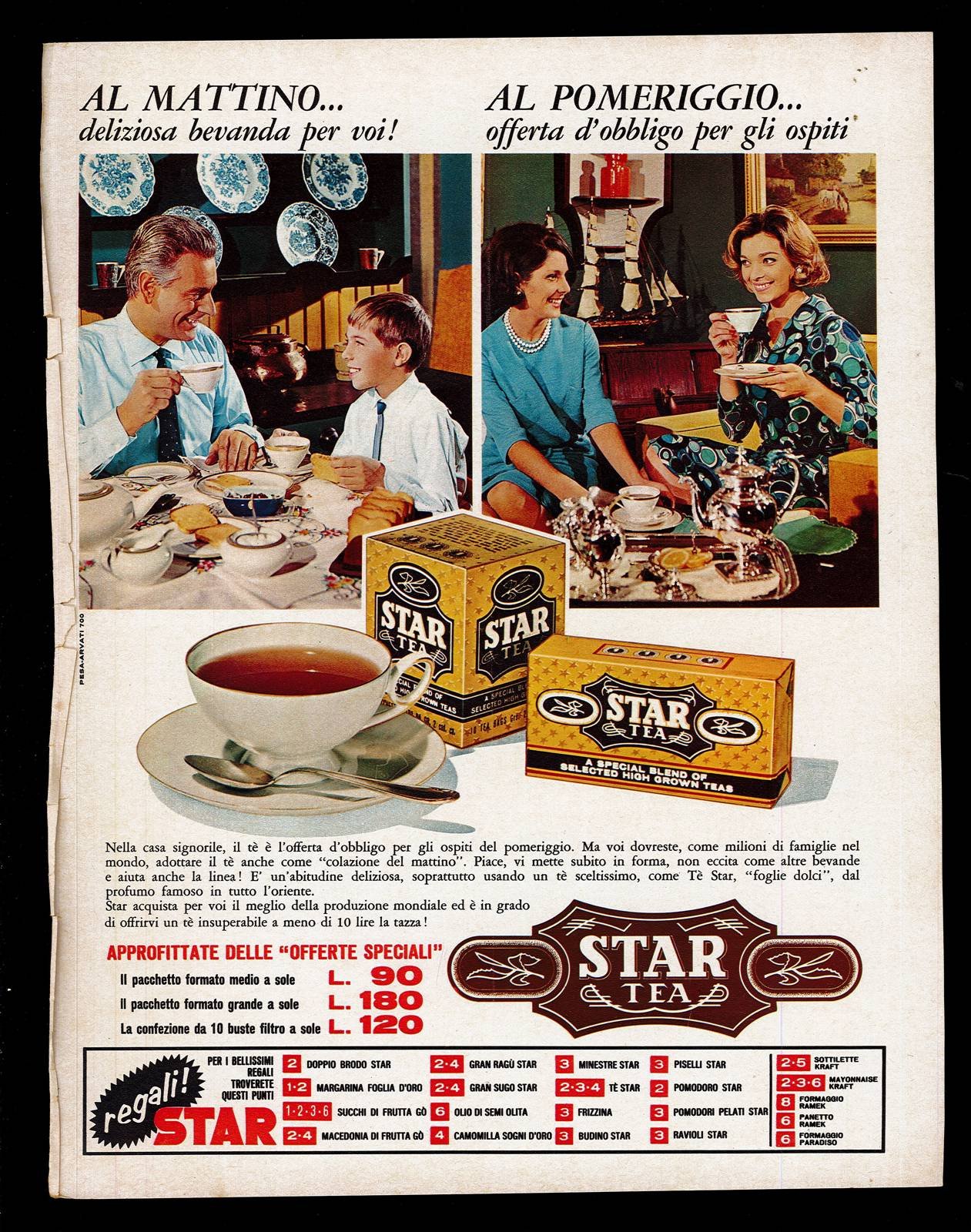 Autore: n.d. Luogo: n.d. Anno: [1960]. Tecnica: offset. Dimensioni: 32x25. Conservazione: buone. Foglio sciolto tratto da periodico anni '60, pagina pubblicitaria Star Tea