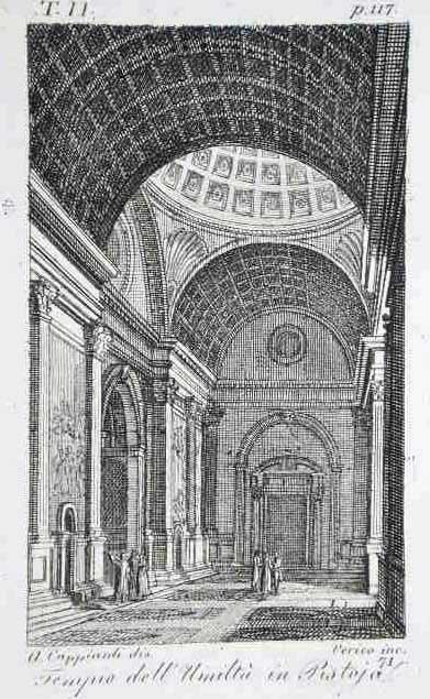 Stampa antica ed originale con veduta dell'interno del tempio. Autore: Verico Antonio. Luogo: Pistoia. Anno: 1827. Tecnica: incisione in rame. Dimensioni: 87x53 mm