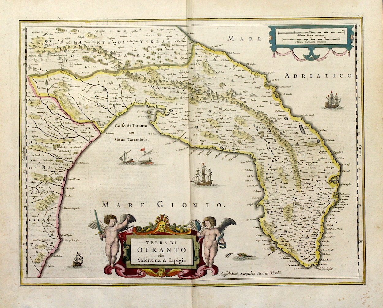 Incisione in rame, mm 375x490, colore d’epoca, testo latino al verso. Tratto da “Gerardi Mercatori et I. Hondii atlas”. Ottimo esemplare.