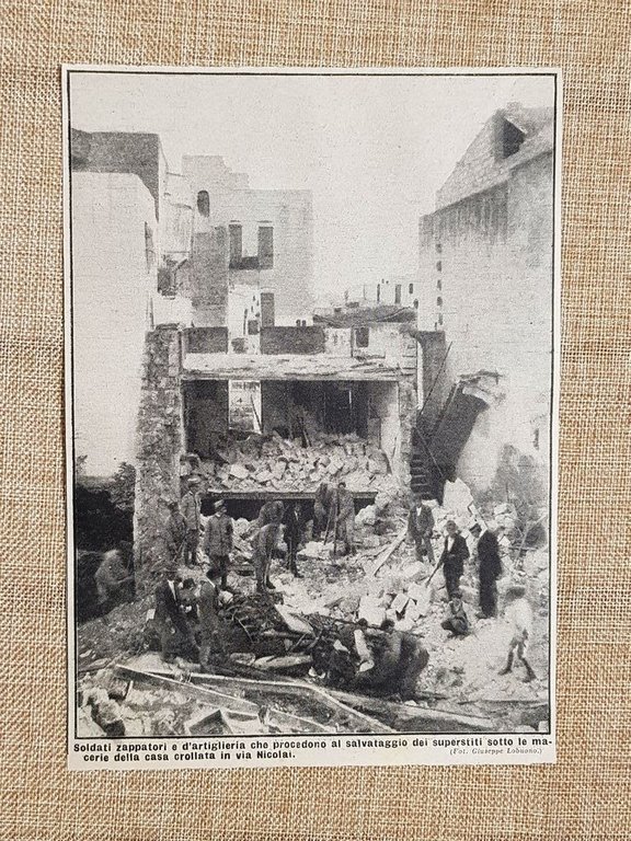 Rara stampa Estratta da Rivista d'epoca del 1915 Il Salvataggio dei Superstiti in Via Nicolai Squadre di soldati zappatori e dell’artiglieria sono impegnate nel soccorso dei superstiti, scavando tra le macerie di una casa crollata in via Nicolai. Dimensioni Cm 13,00 x 18,00 Codice prodotto CCII-111 PayPal Carta di credito Bonifico bancario Inserita dentro plico di adeguate dimensioni per proteggerne l'integrità Spedizione con posta ordinaria o raccomandata scelta dall’Acquirente nel momento del pagamento Clicca qui per accedere al nostro Store ed al suo sterminato archivio