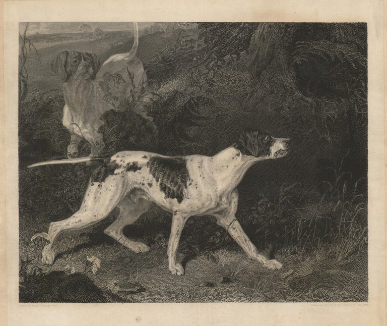 Incisione all'acquaforte stampata su carta cina, antica ed originale, che raffigura due cani Pointer intenti alla ricerca. Autore: Ward Martin Theodore. Luogo: Pointer. Anno: 1831. Tecnica: acquaforte. Dimensioni: 325x405 mm
