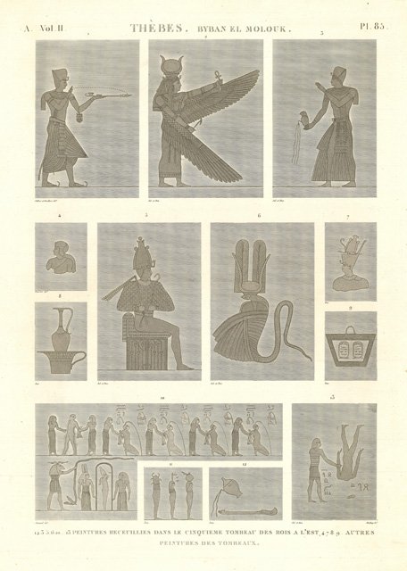 Raffigurazioni di diverse decorazioni dipinte nelle tombe della Valle dei Re, nella Necropoli di Tebe. Tavola incisa all’acquaforte su lastra di rame, inserita nella monumentale opera Description de l’Egypte, II° edizione dal 1820-29 voluta da Luigi XVIII, importante risultato culturale dell’occupazione francese in Egitto per il periodo che va dal 1798 al 1801. Bonaparte decise di invadere queste terre per controllare le vie commerciali verso l’india ed assestare in questo modo un duro colpo all’economia britannica. Durante questa operazione, il Nostro favorì l’attività di numerosi artisti, ingegneri, matematici e naturalisti per registrare e catalogare con estrema precisione le costruzioni e i monumenti egiziani nonché la flora e la fauna. Il risultato di questo immane sforzo, che per la pubblicazione coinvolse quasi duemila tra artisti e tecnici oltre a quattrocento incisori, fu l’opera "Description de l’Egypte, ou recueil des observations et des recherches qui ont été faites en Egypte pendant l’expédition de l’armée française", che offre una globale visione scientifica dell’antico e moderno Egitto, nonché la sua storia naturale. La Description ebbe grande influenza sul movimento orientalista pittorico dell’ottocento e diede un contributo fondamentale alla diffusione dell’Egittologia. Numerosi edifici rappresentati in queste tavole sono stati completamente distrutti nel tempo