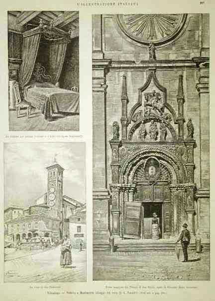 Raffigurazione in tre vignette di dettagli e monumenti della cittadina. Testo al verso.