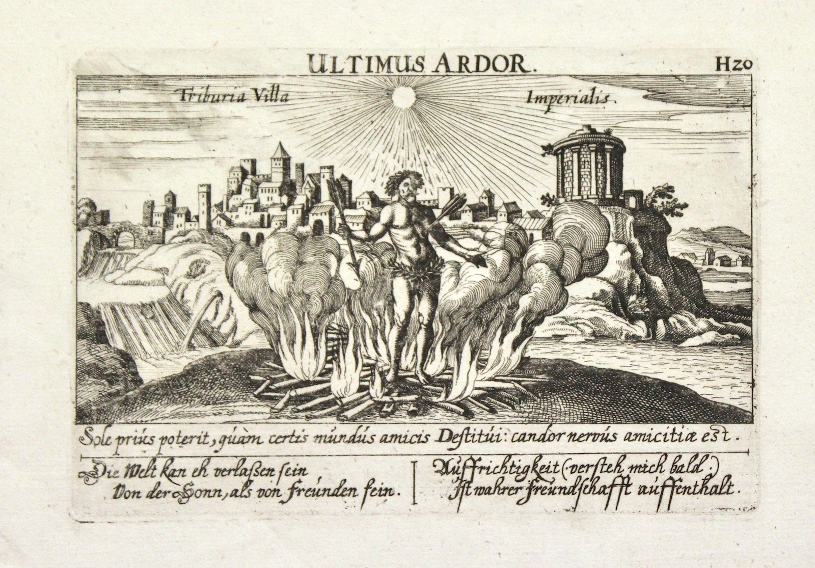 Incisione in rame, 100x145. Bella veduta generale del Villa Imperiale di Tivoli con scena animata in primo piano, tratta da "Sciographia cosmica" e "Thesaurus philopoliticus". Ottimo esemplare ben impresso ad ampi margini.