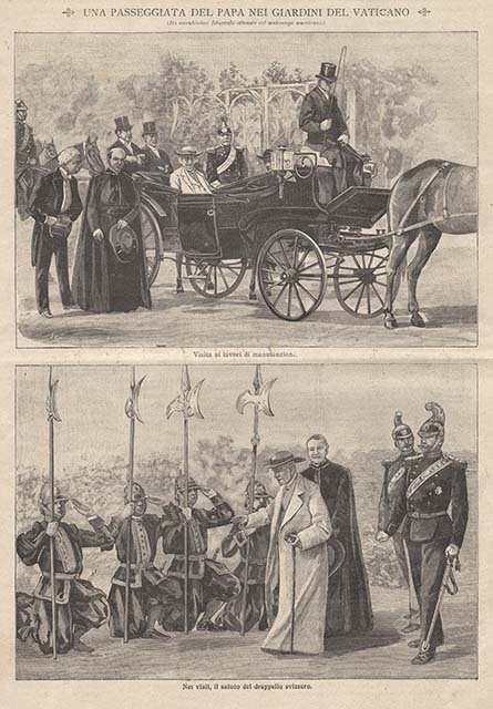 Una passeggiata del Papa nei giardini del Vaticano - Visita ai lavori di manutenzione - Nei viali, il saluto del drappello svizzero | Stampe | Studio Coop inc., Studio Coop inc.