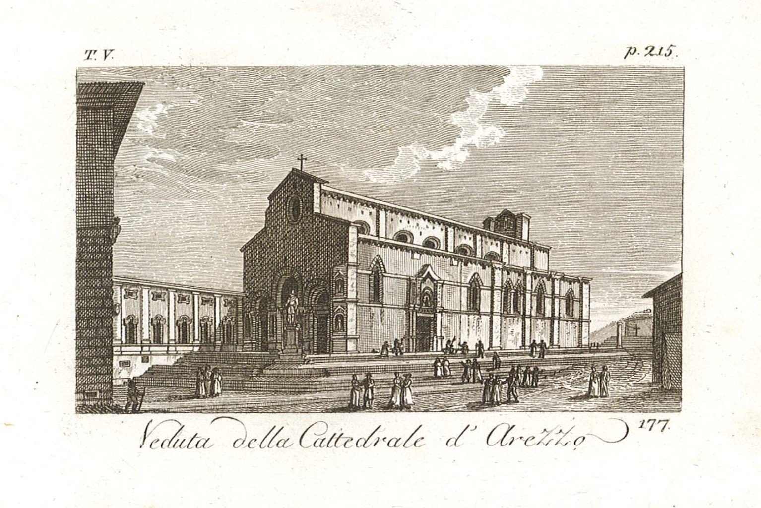 Stampa antica ed originale con veduta della cattedrale e della piazza animata da personaggi. Autore: Verico Antonio. Luogo: Arezzo. Anno: 1827. Tecnica: incisione in rame. Dimensioni: 52x93 mm