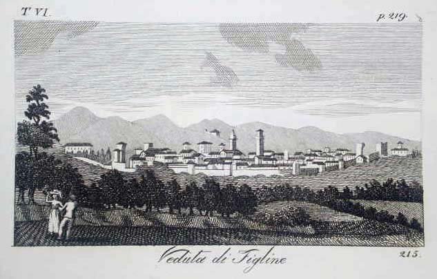 Stampa antica ed originale con veduta panoramica della cittadina. Autore: Verico Antonio. Luogo: Figline Val' Arno - FI. Anno: 1827. Tecnica: incisione in rame. Dimensioni: 53x95 mm
