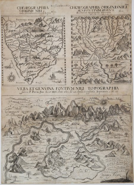 Tavola contenente tre mappe su un unico foglio, che fornisce uno studio delle varie teorie della sorgente del fiume Nilo. La prima mappa mostra le informazioni derivate dalle osservazioni fatte dall'esploratore portoghese Duarte Lopes tra il 1578 e il 1584. ' La seconda mappa mostra le informazioni derivate dalle prime fonti cartografiche arabe. La terza mappa (orientata con il sud in alto) mostra le informazioni derivate dal missionario gesuita spagnolo Pedro Paez, tra il 1618 e il 1621, derivate principalmente dalla sua História da Ethiópia, che non sarebbe stata pubblicata in un'edizione stampata fino al 1905-1917. A Paez si attribuisce la scoperta della sorgente del fiume Nilo Azzurro nelle montagne dell'Etiopia (lago Tana). Paez riferì che lì c'erano due "fontane". Athanasius Kircher (1601-1680) era un prete gesuita e uno studioso molto rispettato, noto per il suo ruolo nella diffusione della conoscenza. Kircher fu educato in greco, ebraico e in materie umanistiche a Fulda, Paderborn, Colonia, Coblenza e Magonza. Dopo essere fuggito dalla Guerra dei trent’anni in Germania, Kircher lavorò come accademico ad Avignone e, dal 1634, a Roma. ' A Roma, Kircher servì come nodo intellettuale, diffondendo informazioni inviate da tutto il mondo dai missionari gesuiti. Interessi particolari includevano l'antico Egitto, l'astronomia, la matematica, la medicina, la musica e le lingue (sia antiche che moderne). Fece anche diverse mappe e fu un compilatore geografico. ' Kircher combinò una miscela di ermetismo con la nascente indagine scientifica, guadagnandosi la reputazione di uno degli ultimi uomini del Rinascimento. Per esempio, osservò le eruzioni dell'Etna e dello Stromboli. Si fece calare nel cratere del Vesuvio subito dopo un'eruzione per osservare i cambiamenti prodotti dal cataclisma. Incisione in rame, alcuni restauri al bordo destro e all'angolo inferiore sinistro, altrimenti buone condizioni. Rara. Rare set of 3 maps on a single sheet, providing a study of the various theories of the source of the Nile River. The first map shows the information derived from observations made by the Portuguese explorer Duarte Lopes between 1578 and 1584. ' The second map shows information derived from early Arab cartographic sources. The third map (oriented with south at the top) shows the information derived from the Spanish Jesuit missionary Pedro Paez, between 1618 and 1621, derived primarily from his História da Ethiópia, which would not be published in a printed edition until 1905-1917. Paez is credited with the discovery of the source of the Blue Nile River in the mountains of Ethiopia (Lake Tana). Paez reported that there were two "fountains" there. ' Athanasius Kircher (1601-1680) was a Jesuit priest and a well-respected scholar known for his role in disseminating knowledge. Kircher was educated in Greek, Hebrew, and the humanities at Fulda, Paderborn, Cologne, Koblenz, and Mainz. After fleeing the Thirty Years’ War in Germany, Kircher worked as an academic at Avignon and, from 1634, Rome. ' In Rome, Kircher served as an intellectual node, spreading information sent from around the world by Jesuit missionaries. Particular interests included ancient Egypt, astronomy, mathematics, medicine, music, and languages (both ancient and modern). He also made several maps and was a geographic compiler. It is likely he was the first person to depict the Pacific Ring of Fire on a map. Kircher combined a mixture of hermeticism with nascent scientific inquiry, gaining him a reputation as one of the final Renaissance men. For example, he observed the eruptions of Etna and Stromboli. He had himself lowered into the crater of Vesuvius soon after an eruption to observe the changes wrought by the cataclysm. He experimented with bioluminescence by seeking the applications of firefly extract as a light source. He also made the first known Aeolian harp. ' Kircher wrote 44 books, while over 2,000 of his manuscripts and letters survive. He also assembled one of the first natural history collections, the Museo Kircheriano or the Kircherianum, which was broken up after his death and became the foundation of several institutional collections. Copper engraving, some expert reapirs at the right edge and at the lower left corner, otherwise good condition. Cfr.