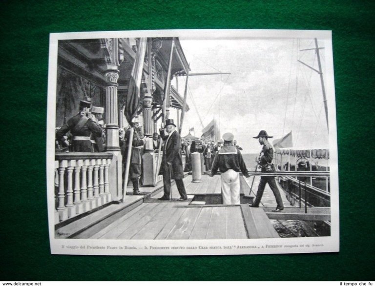 Rara Incisione Estratta da Rivista d'Epoca del 1897 Viaggio Presidente Faure in Russia 1897 Il Presidente seguito dallo zar sbarca dall' "Alexandra", a Peterhof Dimensioni 26x20cm II1897-01 Qualora vogliate delle scansioni migliori contattateci, soddisferemo ogni vostra richiesta. Paypal Carta di credito Bonifico bancario Accuratamente adagiate su un cartoncino e protette da pellicola trasparente rigida il tutto viene inserito dentro plico di adeguate dimensioni per proteggerne l'integrità
