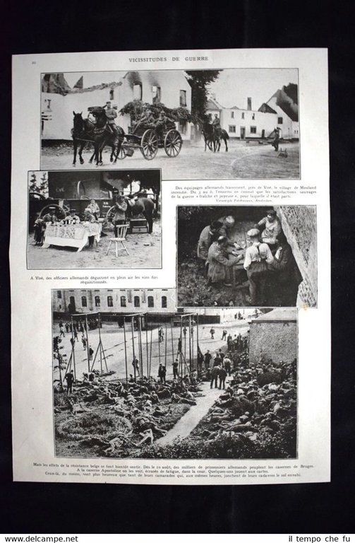 Rara stampa Estratta da pubblicazione del 1922 sulla Prima Guerra Mondiale del 1914-1918. .stampa che ha quindi oltre 95 anni! Rare print Extracted from publication of 1922 about the First World War of 1914 -1918. . press that has so over 95 years! Impression rare Extrait de la publication de 1922 sur la Première Guerre mondiale 1914-1918 . . press qui a tellement plus de 95 ans! Seltene druck Gewonnen aus der Veröffentlichung von 1922 auf dem Ersten Weltkrieg 1914-1918 . . Drücken, die so über 95 Jahren! Vicissitudes de guerre A Visé, des officiers allemands dégustent en plein air les vins fins réquisitionnés. Des équipages allemands traversent, près de Visé, le village de Mouland incendié. Du 3 au 6, l'ennemi ne connut que les satisfactions sauvages de la guerre "fraiche et joyeuse", pour laquelle il était parti. Mais les effets de la résistence belge se font bientot sentir. Des le 10 aout, des milliers de prisonniers allemands peuplent les casernes de Bruges. A la caserne Apostoline on les voit, écrasés de fatigue, dans la cour. Quelques-uns jouent aux cartes. Ceux-là, du moins, sont plus heureux que tant de leurs camarades qui, aux memes heures, jonchent de leurs cadavres le sol envahi + Premieres visions de guerre L'armée belge combat pied à pied. Voici, en ordre serré, des carabiniers coiffés de leur chapeau de cuir légendaire, haut de forme, qui défendent une route. Au cours de son avance, l'ennemi s'exaspère de la résistance qu'il rencontre. Sur son passage, il a incendé cette ferme près de Haelen. A la gare de Diest, il n'a pas laissé intact un fil télégraphique. Un zeppelin est venu bombarder Anvers sans résultats appréciables les bombes étaient encore peu efficaces. Sans cesse en mouvement, les autos-mitrailleuses blindées belges harcèlent les colonnes allemandes Dimensioni Fronte/retro Cm 26,00 x 35,00+Cm 26,00 x 35,00 ADLG - 018 Qualora vogliate delle scansioni migliori contattateci, soddisferemo ogni vostra richiesta. PaypalCarta di creditoBonifico bancario La stampa verrà inserita all'interno di plico di adeguate dimensioni per proteggerne l'integrità