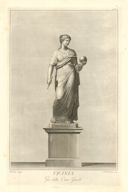 La statua, con sfondo inciso, nella mitologia greca rappresenta Urania, figlia di Zeus e di Mnemosine. Era la musa dell'astronomia e della geometria. Viene rappresentata vestita di un abito elegante dal pregiato panneggio, ha lunghi capelli, sostiene con la sinistra un globo e nella destra ha uno strumento per misurare