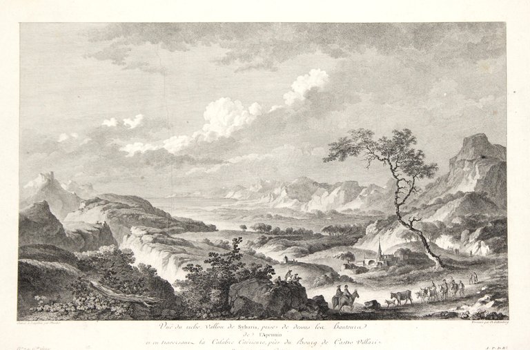 Incisioni in rame di Guttenberg, ca. 245x350. Tratta da "Voyage Pittoresque ou description des Royaumes de Naples et de Sicile", in assoluto una delle più belle ed eleganti opere descrittive del regno di Napoli: composta da cinque volumi usciti dal 1781 al 1786, rappresentò un enorme sforzo economico e tipografico, ripagato peraltro da un successo enorme di vendite, diventando il modello tipografico su cui si basarono molte posteriori opere di viaggio. Bell'esemplare con ampi margini.