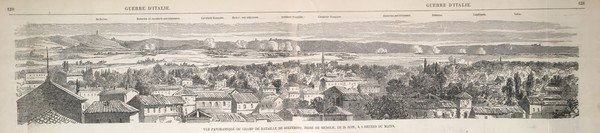 Vue panoramique de champ de bataille de Solferino, prise de Medole le 24 Juin, a 8 heures du matin | Stampe | ignoto, ignoto