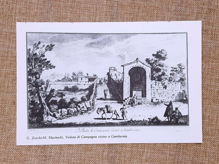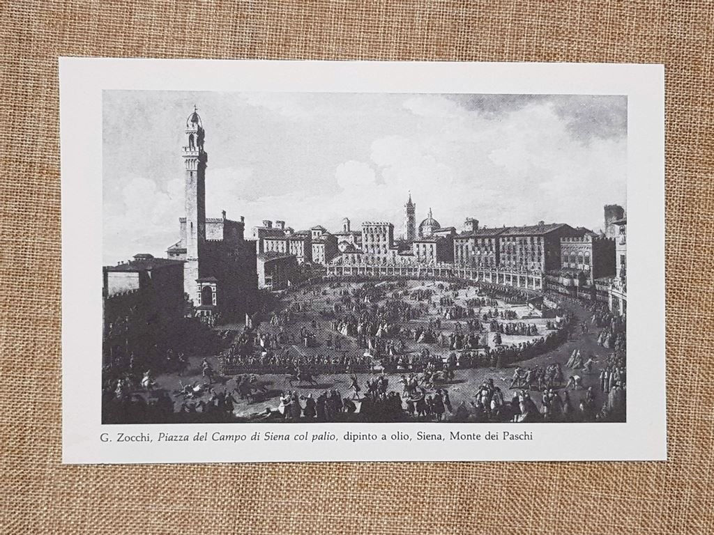 Rara stampa estratta da pubblicazione di fine ‘900 Acquaforte del 1744 incisa da Michele Marieschi su disegno di Giuseppe Zocchi, raffigurante una veduta di campagna nei pressi della villa di Gamberaia, celebre dimora sulle colline di Settignano. La scena, animata da figure e dettagli architettonici, unisce la precisione topografica tipica di Zocchi al segno elegante e scenografico di Marieschi. L’opera fa parte della serie Vedute delle ville e d’altri luoghi della Toscana, commissionata dal marchese Andrea Gerini e pubblicata a Firenze tra il 1744 e il 1757. Un foglio di grande interesse storico-artistico, ideale per collezionisti di vedutismo settecentesco e amanti della grafica toscana. E Dipinto a olio di Giuseppe Zocchi (Firenze, 1717 – 1767) raffigurante la Veduta diurna di Piazza del Campo col Palio corso il 2 aprile 1739 in onore di Francesco I di Lorena e Maria Teresa d’Austria. L’opera immortala il Palio straordinario organizzato per celebrare l’arrivo a Siena dei nuovi granduchi, con una folla festante, dettagli architettonici minuziosi e la corsa dei cavalli attorno alla celebre piazza. Realizzato su commissione di Orazio Sansedoni, il dipinto si ispira a incisioni di Domenico Rossi del 1717, pur arricchendosi della vivace sensibilità pittorica di Zocchi. Conservato presso il Museo San Donato della Banca Monte dei Paschi di Siena, è un capolavoro del vedutismo settecentesco e un documento iconografico di eccezionale valore storico e artistico. Dimensioni fronte/retro: Cm 18,00 x 12,00 + Cm 18,00 x 12,00 Codice prodotto: X - 48 PayPal Carta di credito Bonifico bancario Inserita dentro plico di adeguate dimensioni per proteggerne l'integrità Spedizione con posta ordinaria o raccomandata scelta dall’Acquirente nel momento del pagamento Clicca qui per accedere al nostro Store ed al suo sterminato archivio